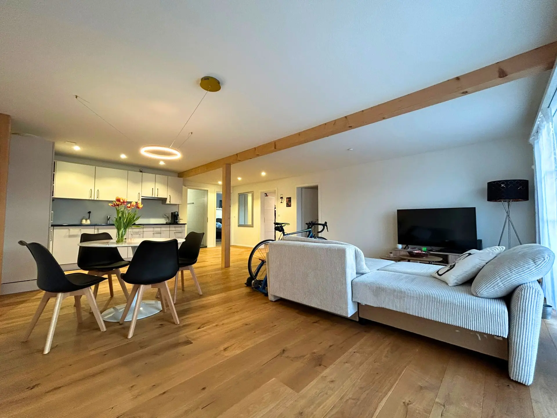 Mit einer Nettowohnfläche von rund 107 m² überzeugt die Wohnung durch einen grosszügigen, offen gestalteten Wohn-, Ess- und Kochbereich. Die moderne Küche mit klaren Linien und hochwertigen Geräten ist funktional eingebettet und bildet zusammen mit dem Wohnraum das Herzstück der Wohnung. Grosse Fensterfronten sorgen für viel Tageslicht und schaffen eine angenehme, offene Atmosphäre.