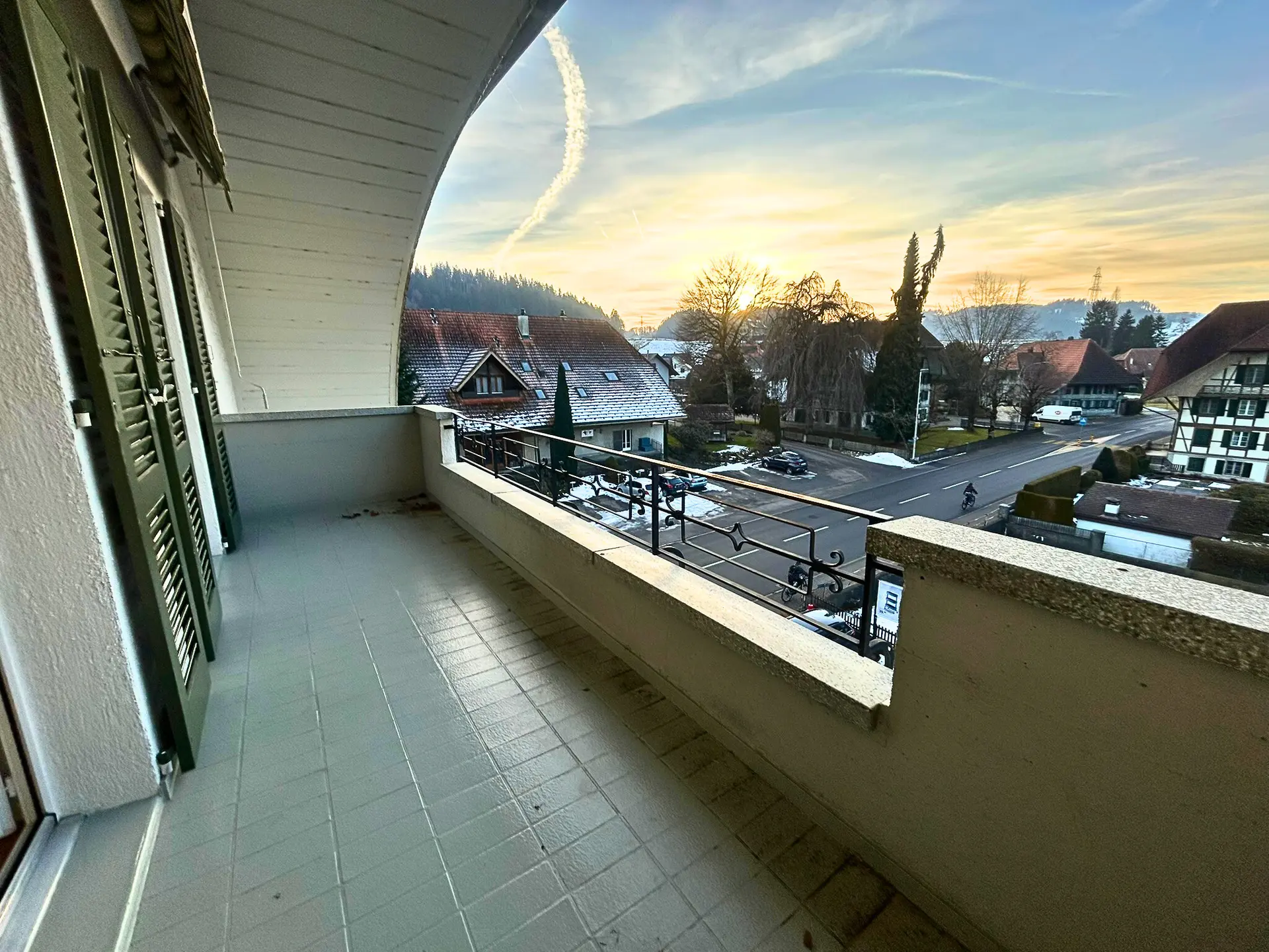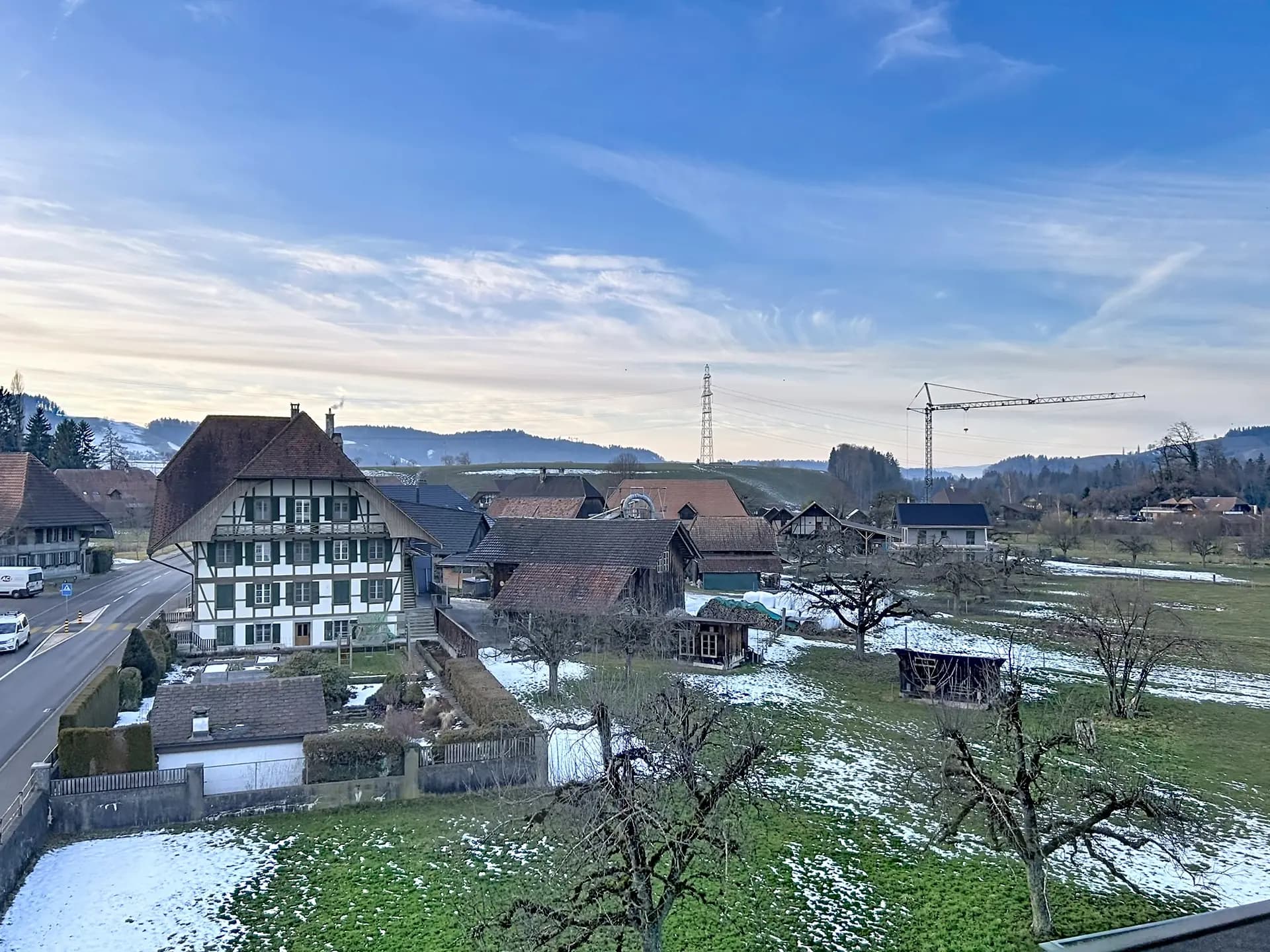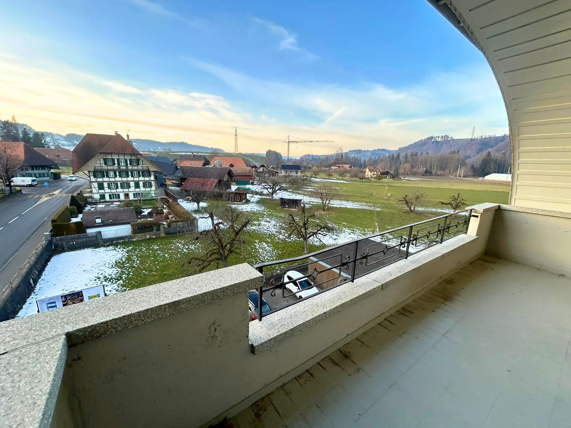 Ein besonderes Highlight ist der grosszügige Balkon mit Weitsicht, der zum Entspannen einlädt und den Blick über das Emmental öffnet. Hier lässt sich der Alltag bewusst entschleunigen – ob morgens mit Kaffee oder abends bei Sonnenuntergang.