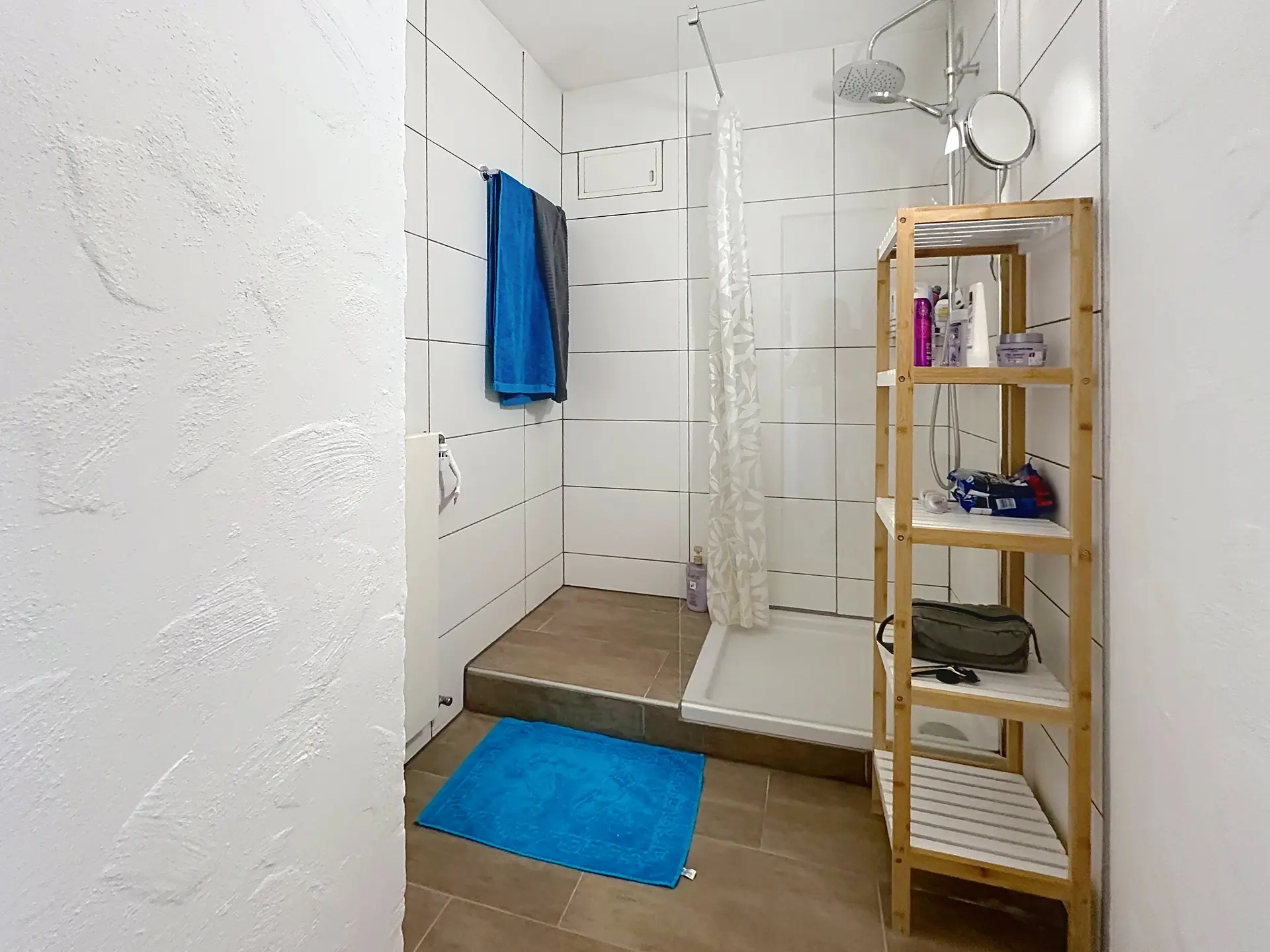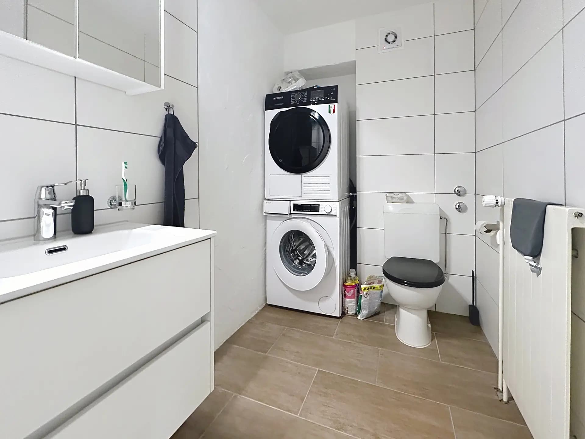Das Badezimmer ist hochwertig ausgestattet mit begehbarer Dusche, separatem WC sowie integriertem Wäscheturm – funktional und durchdacht. Eichen-Landhausdielen in den Wohn- und Schlafräumen sowie zeitlose Fliesen in den Nasszellen unterstreichen den modernen Charakter der Wohnung.