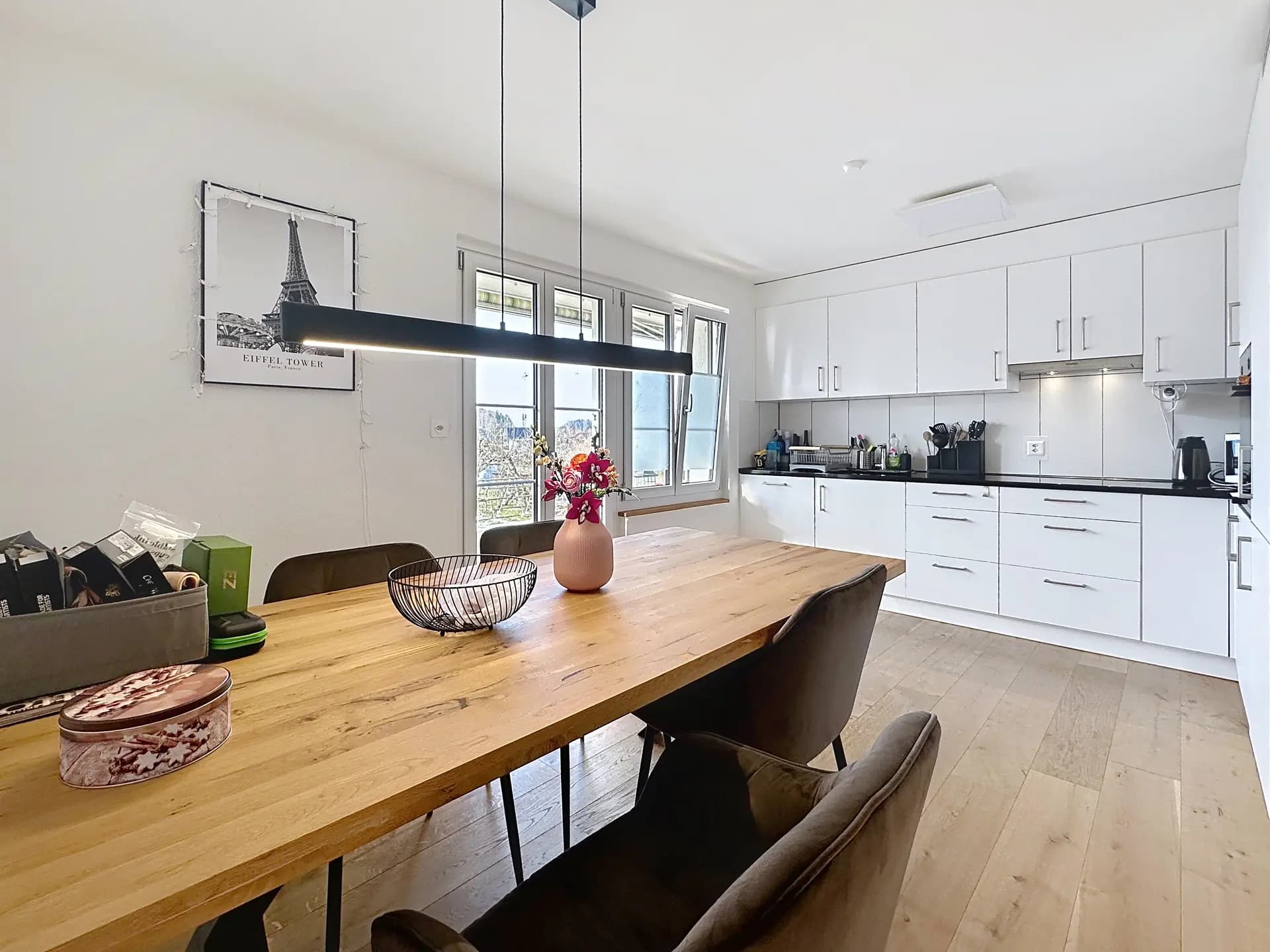 Mit einer Nettowohnfläche von rund 89 m² präsentiert sich die Wohnung spürbar grosszügig und gut proportioniert. Der offene Wohn-, Ess- und Kochbereich bildet das Herzstück des Zuhauses. Die moderne Küche mit hochwertigen Einbaugeräten ist funktional integriert und bietet ausreichend Platz für gemeinsames Kochen und Essen. Grosse Fensterflächen sorgen für helle Räume und ein angenehmes Wohngefühl.