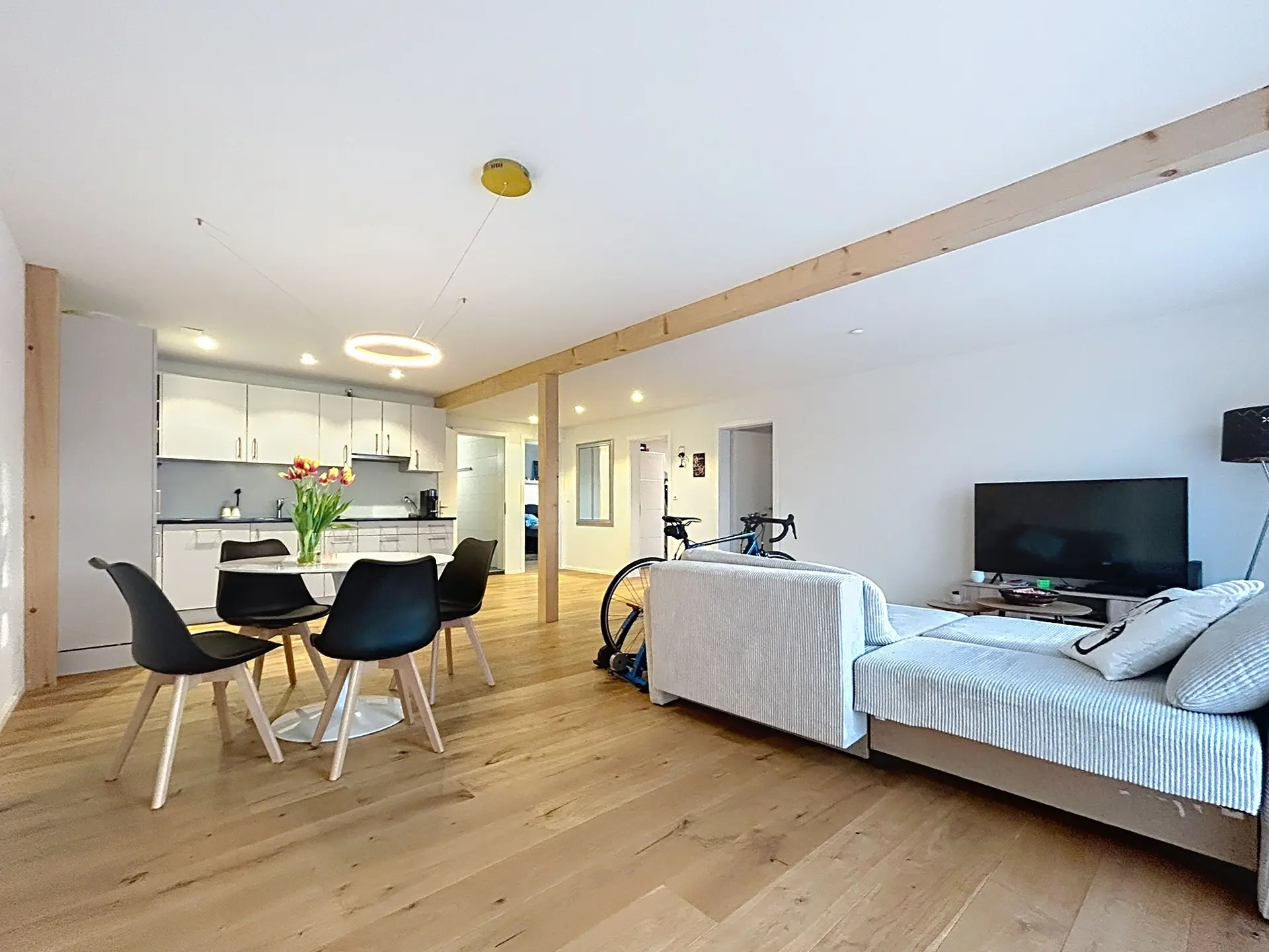 Mit einer Nettowohnfläche von rund 107 m² überzeugt die Wohnung durch einen grosszügigen, offen gestalteten Wohn-, Ess- und Kochbereich. Die moderne Küche mit klaren Linien und hochwertigen Geräten ist funktional eingebettet und bildet zusammen mit dem Wohnraum das Herzstück der Wohnung. Grosse Fensterfronten sorgen für viel Tageslicht und schaffen eine angenehme, offene Atmosphäre.
